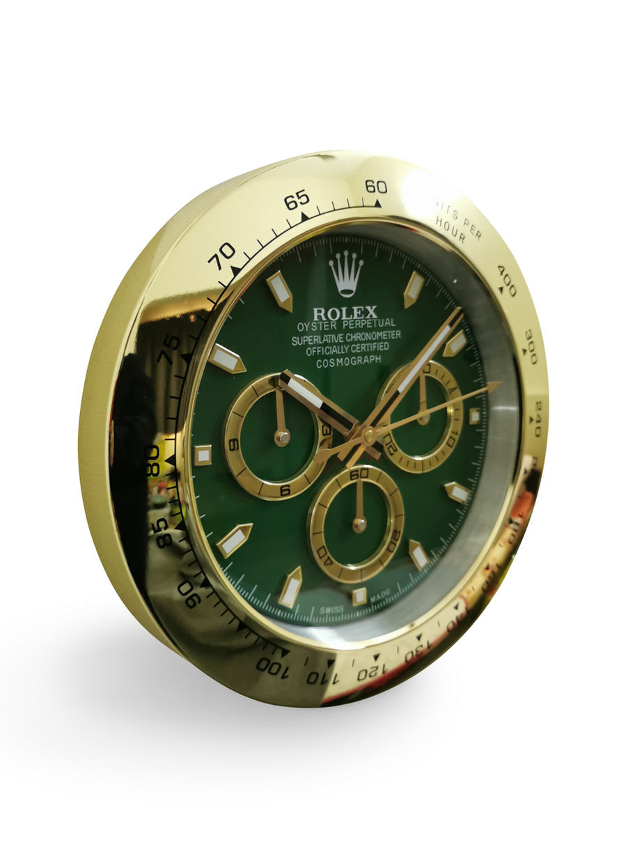 Elevate your space with the Rolex Cosmograph Wall Clock, a stunning blend of sophistication and precision. Featuring a luxurious green dial paired with elegant gold accents, this timepiece captures the essence of Rolex’s iconic design and craftsmanship. Perfect for offices, living rooms, or any premium interior, it is more than just a clock – it’s a statement of style and luxury.